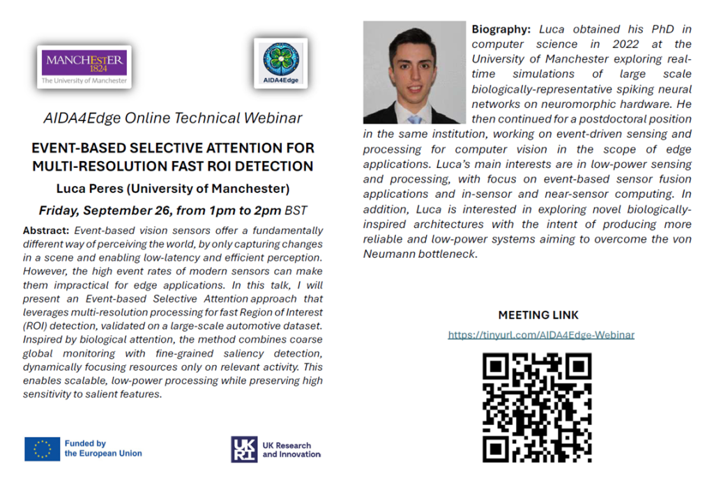 As part of the AIDA4Edge project, a technical webinar was held on September 26, 2025, featuring an insightful talk by Luca Peres from the University of Manchester, titled:
